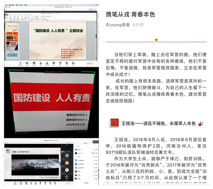 5月16日,我院推出微信公众号文章《携笔从戎青春本色》,对我院优秀大学生士兵事迹进行宣传报道,激发广大适龄青年投身军营报效国家、立志军营成长成才。5月16-22日,农学院各班级召开“国防建设,人人有责”主题班会,班会由各班辅导员主持。