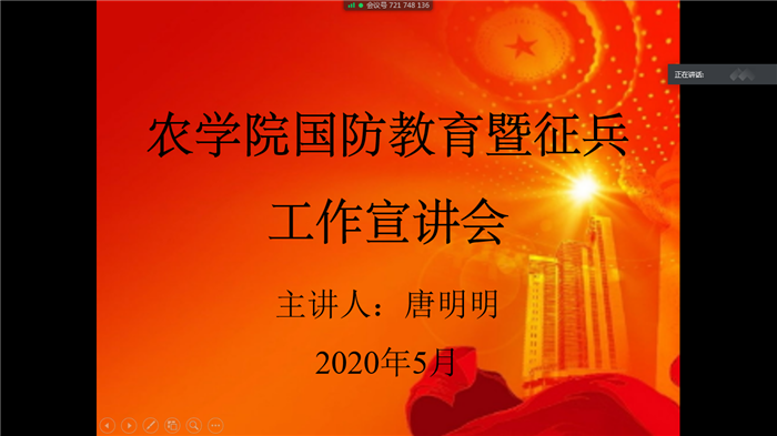 为加强当代大学生国防意识,普及国防知识,鼓励大学生积极投身到国防建设中去。2020年5月22日,我院召开了国防教育暨征兵工作宣讲会。主讲人由学院武装专干唐明明担任。