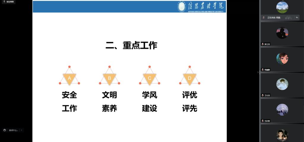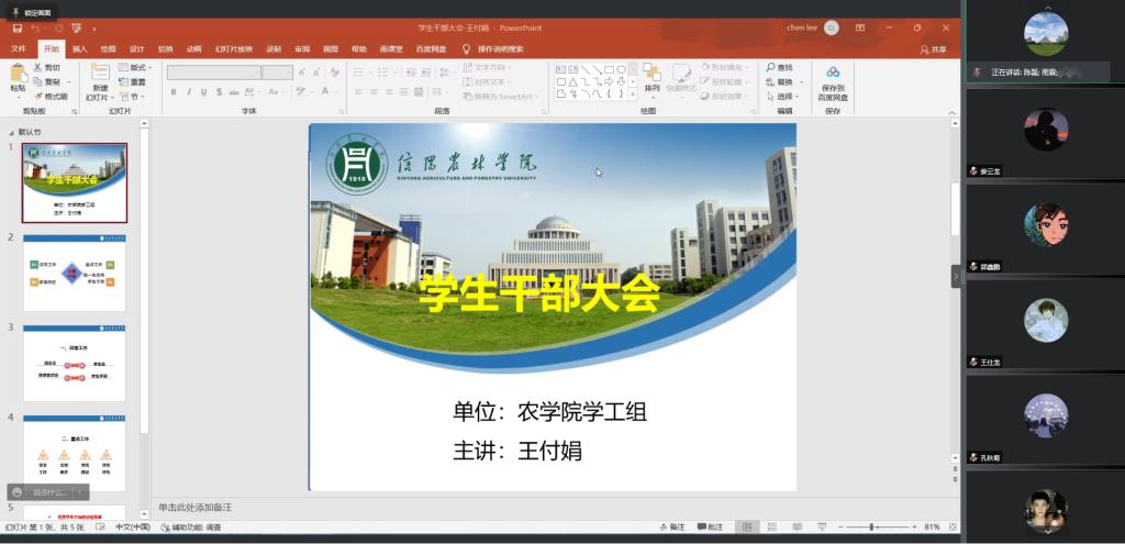 为了加强学生干部思想素养和工作能力,培养学生干部“比、超、赶、拼”的工作作风,发挥学生干部的先锋模范作用。2022年3月21日,农学院组织召开全体学生干部线上视频会议。院党总支副书记王付娟,学工组陈磊老师出席本次会议,农学院全体学生干部及各班班长、团支书参加。