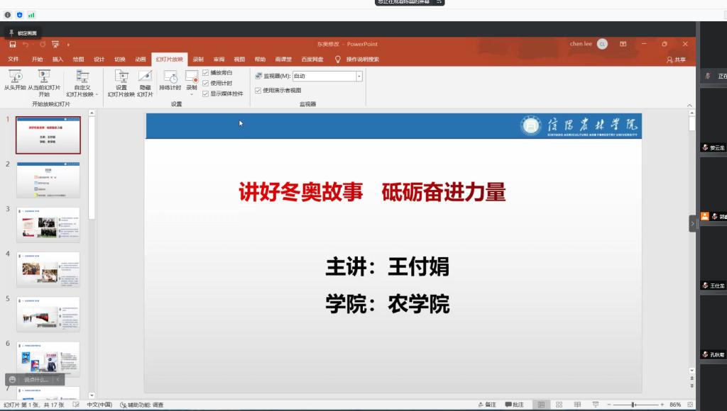 随后,王书记简要总结了近期学生会及各班工作存在的不足,要求与会人员一是要清楚认识并担负起自己的职责,及时梳理总结每周的工作问题和收获,汲取经验,勇于改正;二是要严格遵守学校封校期间的疫情防控规定,规范班级请销假流程;三是加强学生干部专业知识学习。最后,王老师为全体学生干部上了一堂以“讲好冬奥故事,砥砺奋进力量”为主题的思政课,同学们在冬奥故事中见证奥运健儿们可敬、可爱、可信的卓越风采,鼓励大家在“青春无敌”的姿态中汲取“中国力量”。