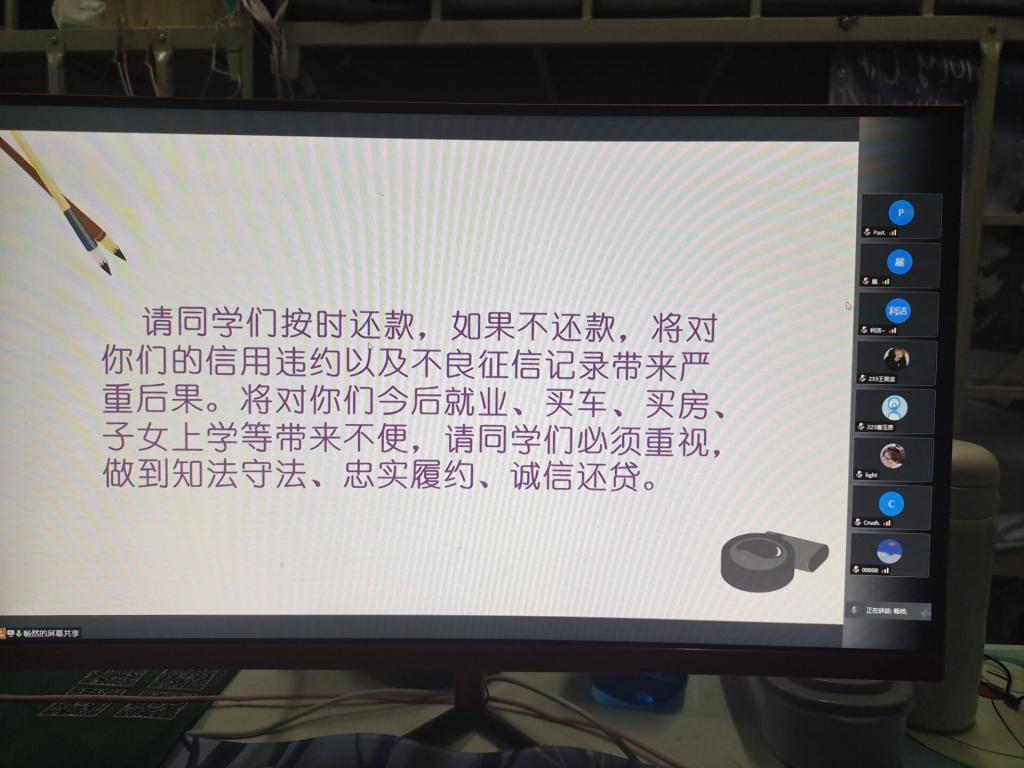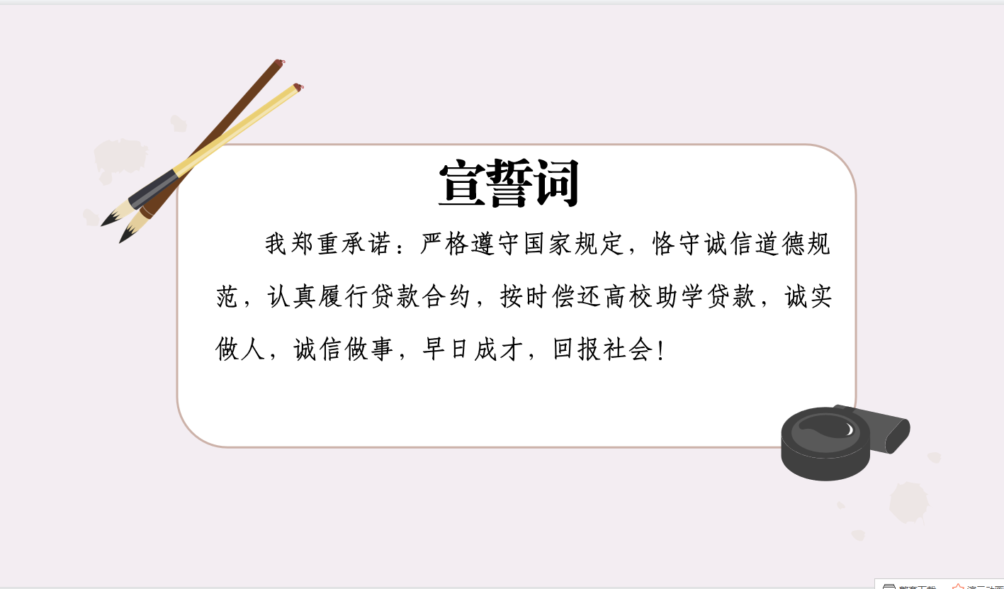 会上,杨老师首先向同学们讲解了毕业确认事项、申请提前还款、还款具体流程。然后资助部成员带领同学们进行了宣誓,同时提醒借贷同学按时还款,如果不还款,将会对他们的信用违约以及不良征信记录带来严重后果,将对他们今后就业,买车,买房,子女上学等带来不便,让同学们必须重视,做到知法守法,忠实履约,诚信还贷。最后贷款学生们表示要严格遵守国家规定,恪守诚信道德规范,认真履行贷款合约,按时偿还高校助学贷款,诚实做人,诚信做事,早日成才,回报社会。我们也将会在本次活动结束后积极关注借贷学生的偿还情况,及时提醒,争取让他们早日还款。