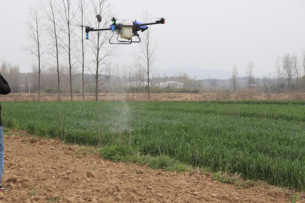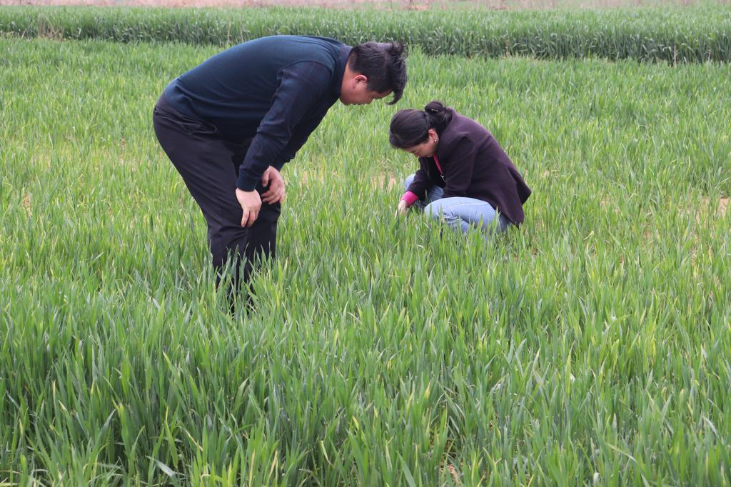 王付娟老师首先带领实践小分队学生前往羊山村小麦田,实地查看了小麦的生长状况,在发现麦田里杂草生长旺盛时,小分队成员积极行动,帮助当地农户锄草。同时,郭世保、孙君艳教授带领小分队学生开展麦田病虫害调查,并针对病虫害防治和田间管理提出了合理化建议。他指出,小麦生长旺盛期也是多种小麦病虫害发生的高峰期,虫害主要有蚜虫、粘虫、吸浆虫,病害主要有白粉病、小麦锈病、赤霉病等,防治小麦病虫害一定要树立预防为主的意识,一旦发生病虫危害,要及时进行防治。最后,郭老师与学生一起用农用无人机给麦田喷洒杀虫剂。