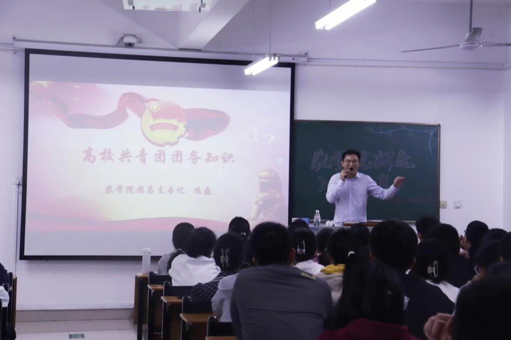 2023年9月25日上午,农学院在二教109开展新生入学教育之团务知识讲座,该讲座由我院团总支书记陈磊主讲,2023级全体新生参加。