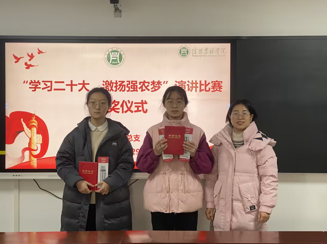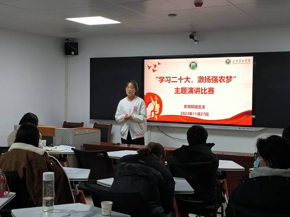 2023年11月27日晚,农学院团总支在学术交流中心520室举办以“学习二十大,激扬强农梦”为主题的演讲比赛,本次活动邀请我院团总支书记陈磊、学工组杨春玲老师、李敏博士、冯凡博士担任评委。