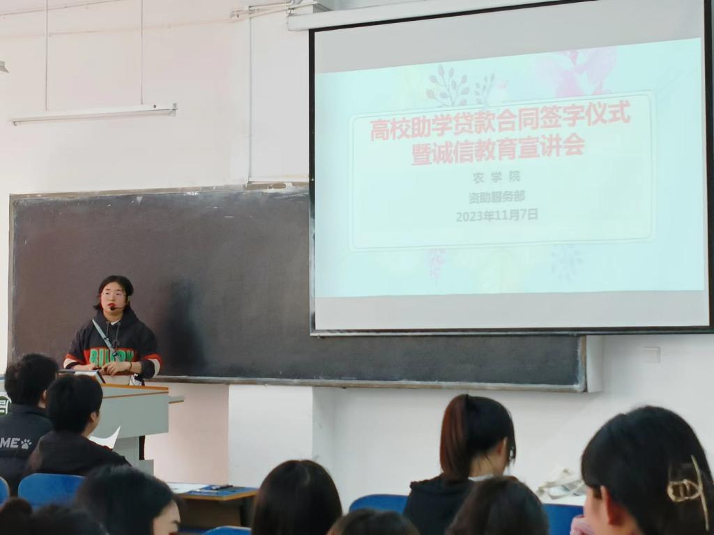青春启航,助学圆梦。为推进我院高校助学贷款工作持续健康开展,为国家培养优秀人才,实现教育公平,使家庭经济困难学生能够顺利完成学业,增强学生的诚信意识和契约意识。2023年11月7日中午12:00~13:30,农学院在一教A区103举行了高校助学贷款合同签字仪式,学院资助专员杨春玲老师及2023年申请高校助学贷款的80名学生参加了本次活动。