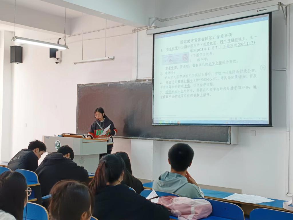 会上,杨老师首先解读了2023年高校助学贷款的政策变化,带领大家学习了贷款合同条款,然后向大家讲解了贷款合同的签订流程、签订注意事项以及还款注意事项,使同学们对国家助学贷款有了进一步的了解。随后,我院申请高校助学贷款的80名学生仔细核对个人信息,逐一签订了贷款合同以及贷款承诺书,在老师的带领下,贷款学生们郑重宣读了诚信誓言。最后,杨老师希望同学们常怀感恩之心,诚信做人、踏实做事,自觉履行还款义务,在校期间勤奋学习,用自己的优异成绩回报国家、社会和自己的家人。