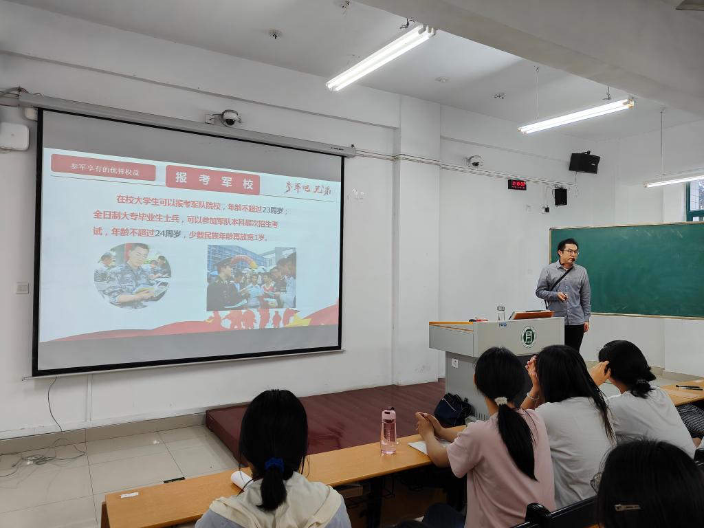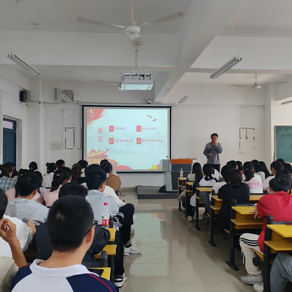为加强新生爱国主义教育,了解参军入伍政策,2024年9月25日,我院组织开展2024级新生国防教育暨入伍政策解读报告,此次活动由院团总支书记、武装专干陈磊主讲,2024级全体新生参加。