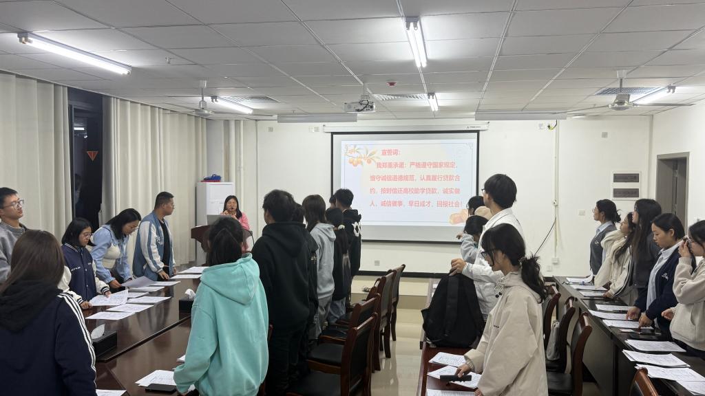 为全面落实国家资助政策,切实帮助家庭经济困难学生无忧入学、安心求学,同时强化学生的诚信意识与责任担当,11月6日晚,我院在3A105举行了高校助学贷款合同签字仪式,学院老师杨春玲、杨帆以及2025年申请高校助学贷款的55名学生参加了本次活动。