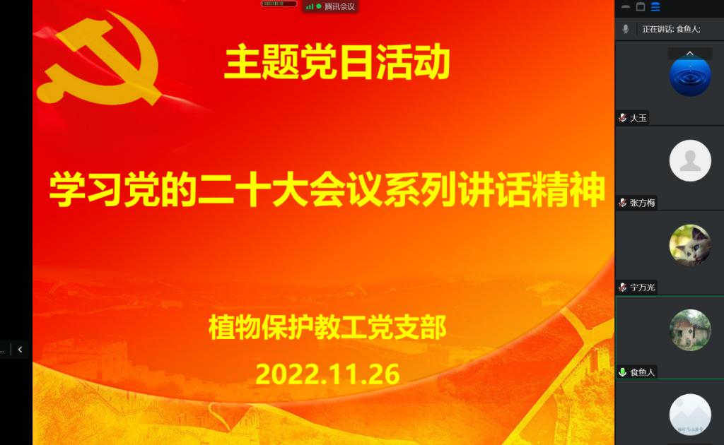 11月26日,植物保护教工党支部召开了“学习党的二十大会议系列讲话精神”主题党日活动。支部全体党员同志参加。