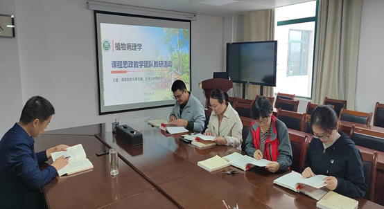 在会上,负责人陈利军教授还为团队成员发放了《植物保护专业课程思政案例库》和《论“三农”工作》这2本研学材料,并领学了部分内容。此次研讨会,不仅让参会成员学习到了思政元素应用的新途径,也更好地推动了植物病理学思政团队的建设。(撰稿/智亚楠 摄影/逯麒森)