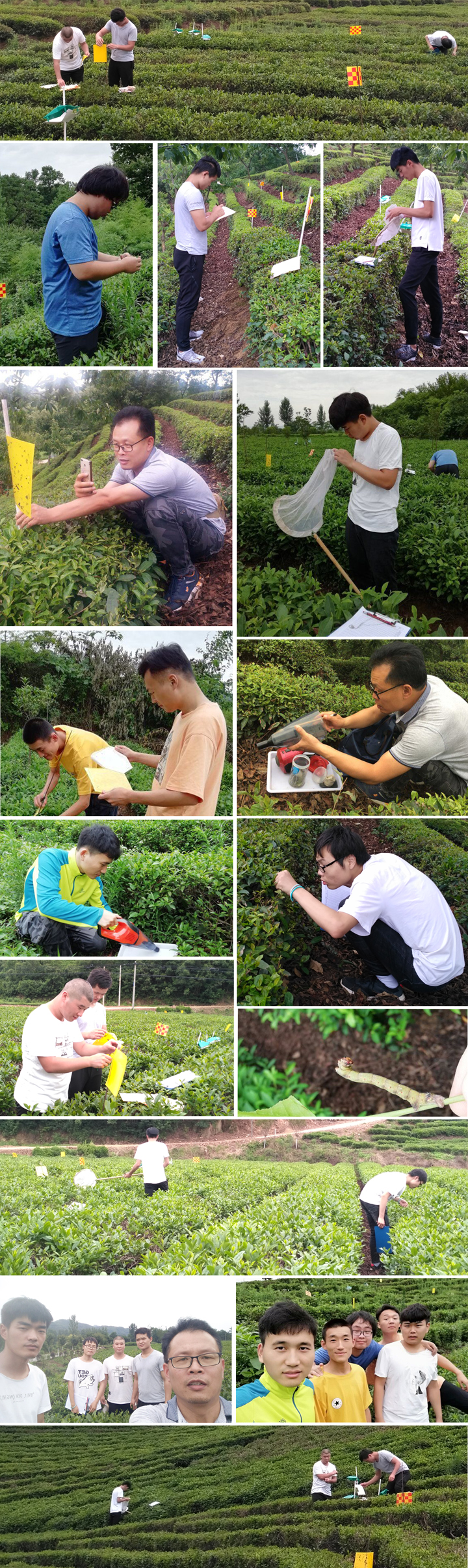 2019年6月30日,雨后初晴的茶园,新枝吐绿,生机勃勃。考试周刚刚结束,农学院植物保护教研室昆虫科研小组耿书宝和潘鹏亮就带领植保专业毕业生继续开展茶园害虫发生规律调查研究。