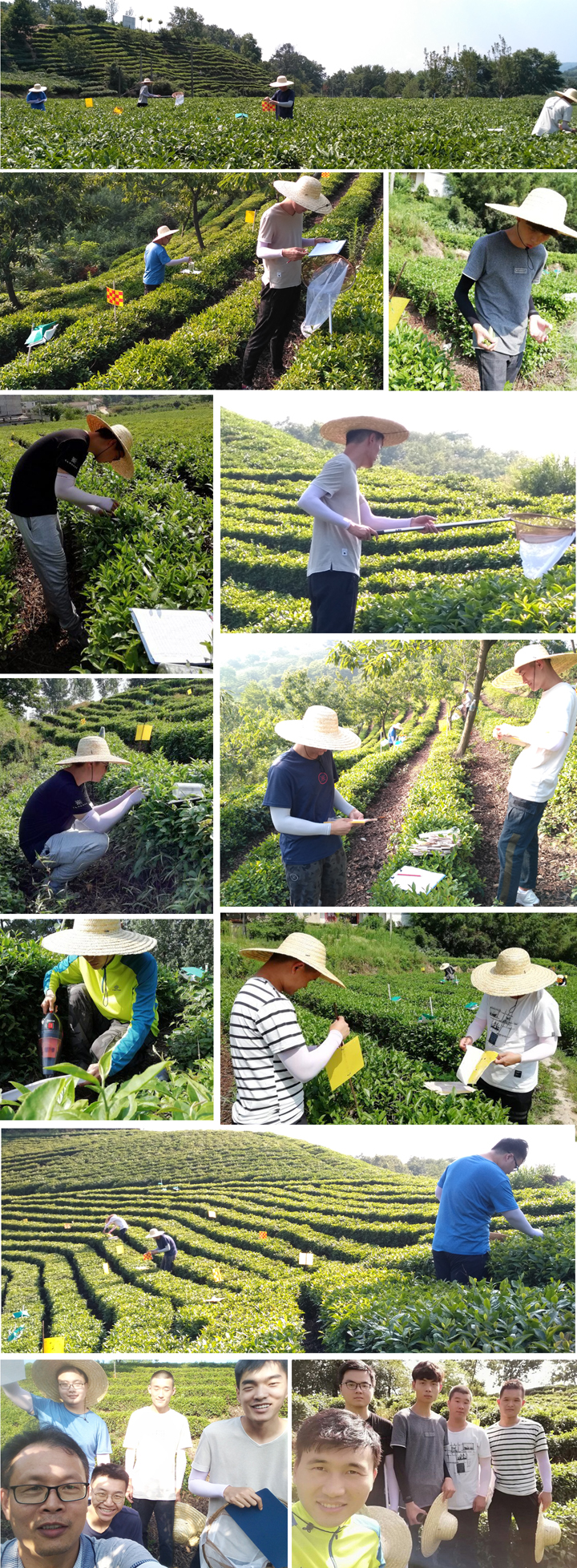 2019年7月14日,按传统历法已经进入初伏第三天,烈日普照下的茶园人迹稀少。而植物保护教研室师生和往常一样,仍然活跃在茶园。本次害虫发生规律调查由耿书宝和潘鹏亮两位老师带队,假期选择留校的植物保护专业本科毕业生穆志超等8位学生参加。