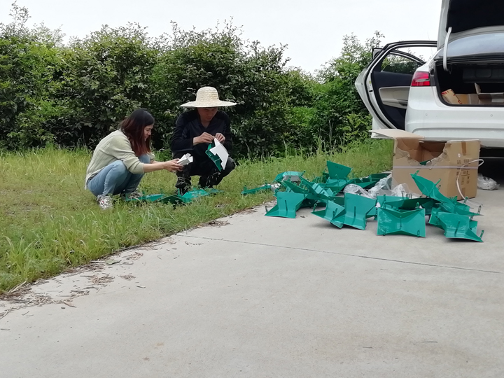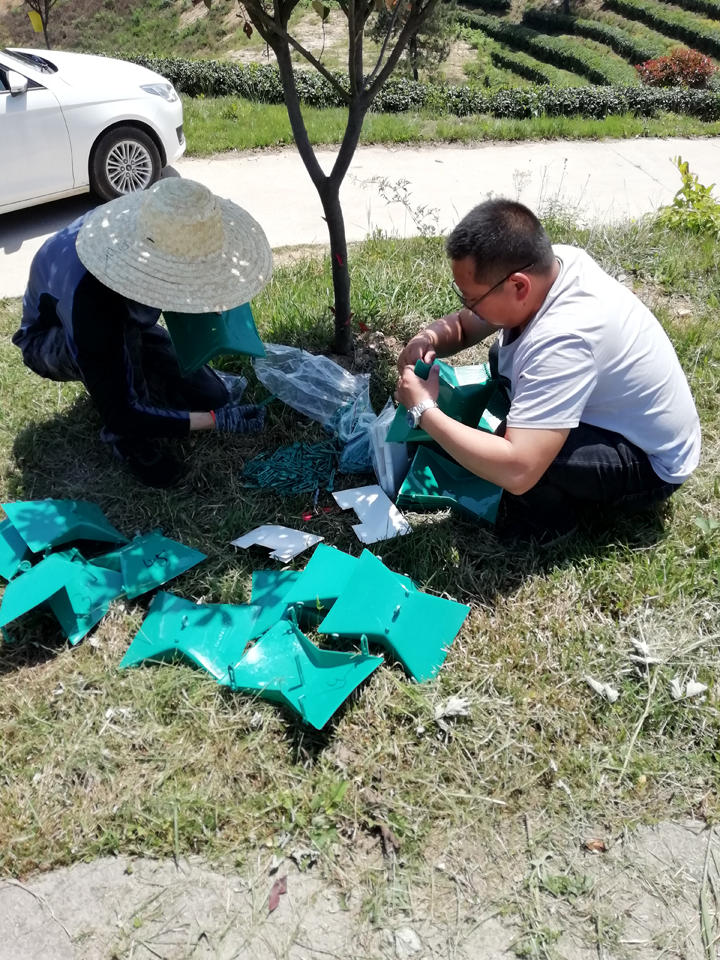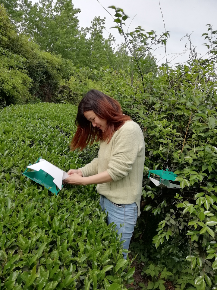 当天下午,两位老师又来到信阳申林茶业开发有限公司,与该公司副总经理马健商议后,决定在该公司选择三个有代表性的地点,也悬挂了灰茶尺蠖和茶毛虫的性信息素诱捕器。项目组成员通过与该茶园的长期合作,建立长期病虫害监测点,推广“两减一增”项目研发的新模式,为茶树病虫害的绿色防控和茶产业的绿色发展助力(植物保护教研室)。