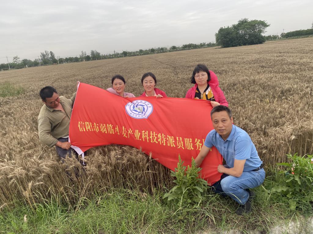 6月1-2日,信阳市弱筋小麦产业科技特派员服务团团长孙君艳教授带领团队成员李传保、刘红敏、董丽平,赴息县宏升粮食制品有限责任公司的弱筋小麦种植基地开展科技服务,了解基地小麦收割情况并查看小麦成熟期生长情况。