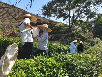 张权老师带领学生对两个地方的茶园管理和害虫发生情况进行了调查。大部分茶园已完成第一次修剪,少量茶园正在修剪中,高海拔地区的白庙村茶园害虫发生数量较少,只有少量的茶小绿叶蝉和茶银尺蠖成虫在茶丛间飞舞,均未达到防治指标。推测与高海拔地区温度相对较低,部分茶园完成修剪有关,通过农事操作可以剪出部分害虫的卵及幼虫,减少茶园药剂的使用,从而实现绿色防控。