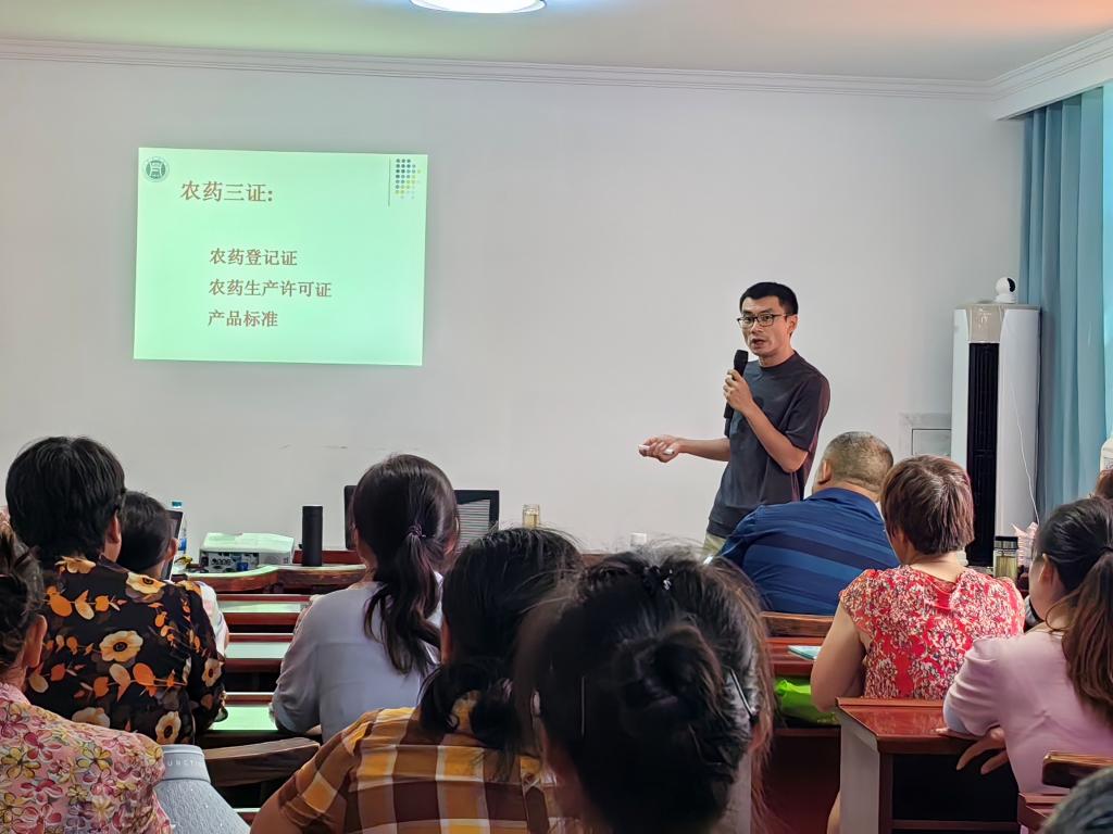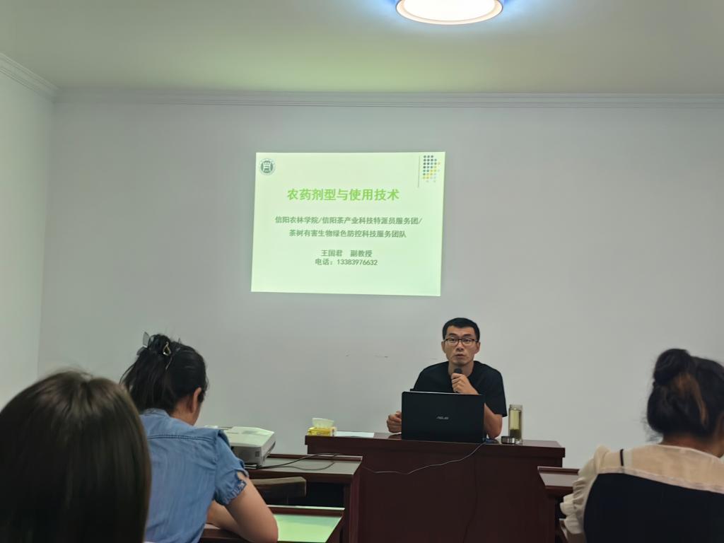 2023年7月24-26日,信阳市茶产业科技特派员服务团科技特派员、校茶树有害生物绿色防控科技服务团队成员王国君,赴吴家店镇聂寨村开展科技服务。王国君分别从“农药剂型与使用方法”、“商品农药的包装与选购”、“农药中毒与解救”和“茶树病虫害绿色防控技术”等方面为兴隆种植合作社、宏达农机合作社的50多名社员现场开展技术培训与指导,并逐一解答社员们关注的问题。此次科技服务提高了社员们对农药使用技术和茶树病虫害绿色防控的理解与认识水平,以培训加强技术指导,以技术助力乡村振兴。