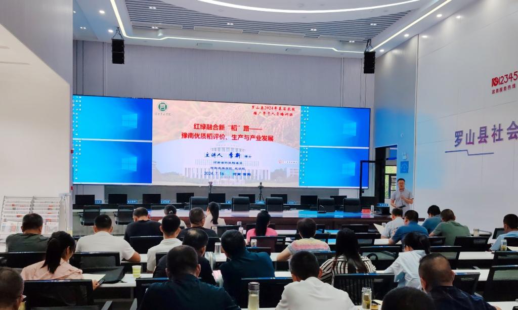 培训会上,季新博士针对豫南地区特有的气候条件和水稻生产种植情况,以红绿融合新“稻”路为主题,分别作了题为“豫南优质稻评价、生产与产业发展”、“豫南优质水稻绿色高效栽培技术”和“豫南再生稻绿色高效栽培技术”的专题讲座。深入浅出地讲解了优质稻的评价指标和方法,豫南优质水稻的产业发展,优质稻品种选择和机械化栽培技术,再生稻栽培管理的关键技术要点以及水稻病虫害绿色防控策略。同时,还介绍了农业生产中的新技术和新方法,强调了科技在农业生产中的重要作用,应重视机械化提高农业生产效率及标准化提高农产品质量。培训现场,季新博士也与参训人员进行了深入交流,并解答相关问题。