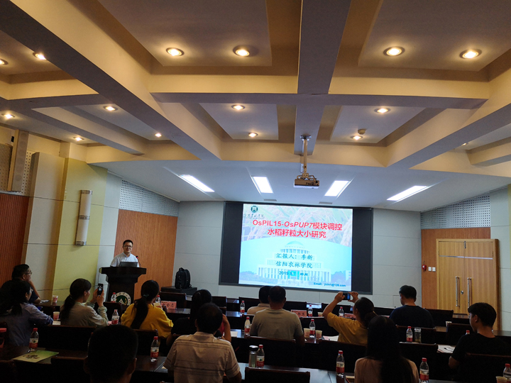 豫南农作物有害生物绿色防控院士工作站粮食作物团队成员季新博士作了题为“OsPIL15-OsPUP7模块调控水稻籽粒大小研究”的大会报告。季博士首先介绍了我院水稻研究的发展情况,随后对OsPIL15调控水稻籽粒大小的机制进行了详细阐述,和与会同行作了深入探讨。会议期间,我院教师和河南农业大学、新乡市农业科学院、南阳市农业科学院及信阳市农业科学院等水稻研究团队就种质资源交流,科研合作等问题进行了深入交流。同时,还看望了今年考取河南农业大学研究生的beat365在线平台官网2015级种子科学与工程专业学生刘灵芝,对我院培养的人才进行了追踪与回访,并勉励其发扬beat365在线平台官网志向立高远,学问做精细的精神,认真学习,刻苦钻研。