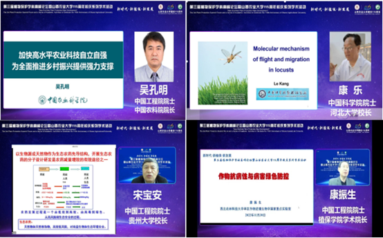 在本次论坛上,吴孔明院士、康乐院士、宋宝安院士、康振生院士分别作了题为《加快高水平农业科技自立自强为全面推进乡村振兴提供强力支撑》、《蝗虫飞行的调控机理》、《生态农药的分子设计与作用机制》、《作物抗病性与病害绿色防控》的学术报告,并与参会人员在云端进行了交流讨论。