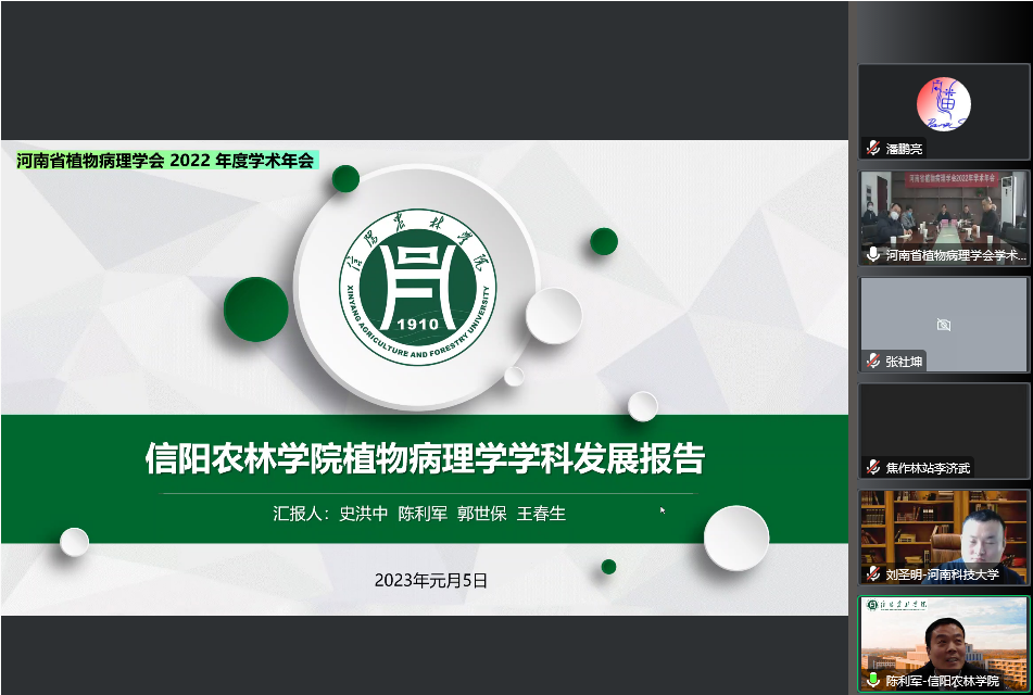 2023年1月5日,河南省植物病理学会召开了2022年度学术年会。会议采取了线上+线下相结合的方式。植物保护教研室史洪中教授、陈利军教授、宁万光副教授、王春生博士等在学术交流中心626会议室beat365在线平台官网分会场参加了会议,教研室其他十几位教师通过线上腾讯会议方式参加了此次学术年会。