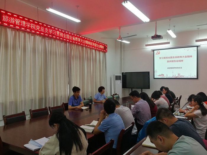 2019年5月28日下午,旅游管理学院党总支学习贯彻全国全省教育大会精神宣讲报告精神,全院教师参加会议,院党总支书记靳潢主持会议。
