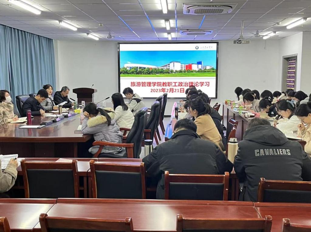 2月21日下午,旅游管理学院党总支在双创中心310会议室开展教职工政治理论学习会。会议由党总支副书记杜丽主持,全体教职工参会,副校长刘开华到位指导。