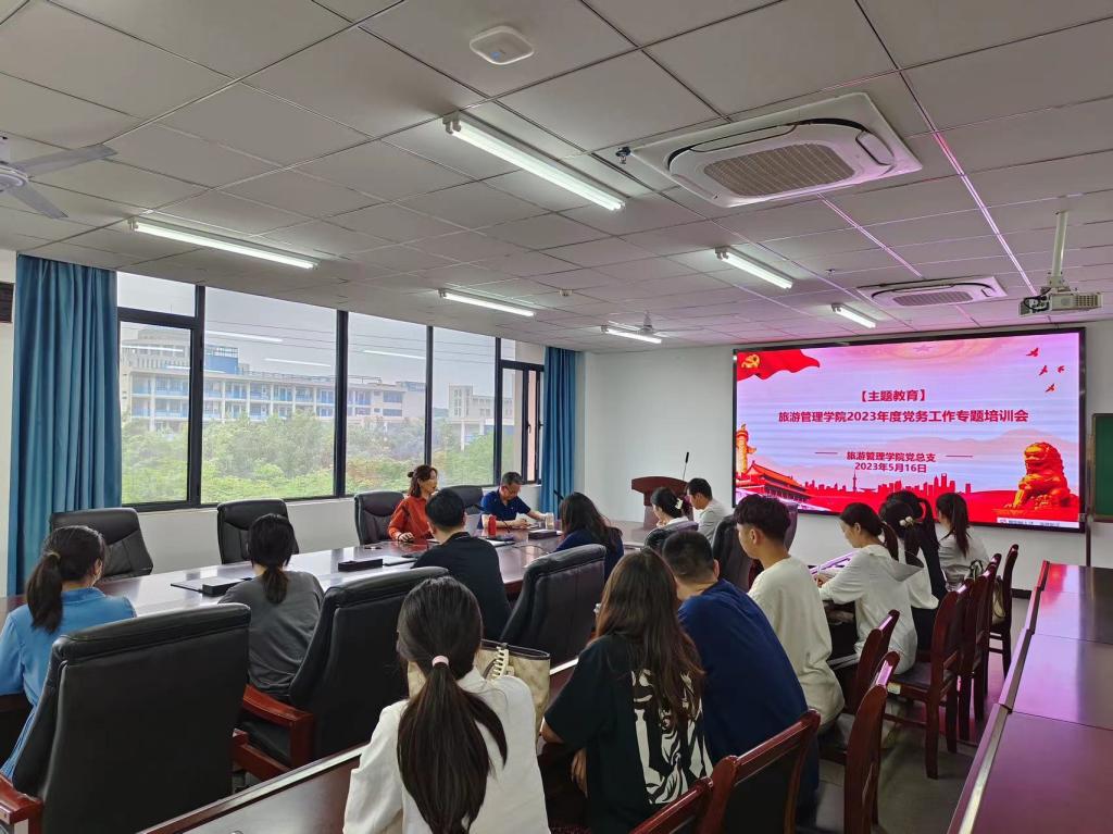 为进一步发挥党员先锋模范作用,学习贯彻习近平新时代中国特色社会主义思想主题教育。5月16日下午,旅游管理学院党总支在310会议室开展2023年党务工作专题培训会。党总支副书记杜丽担任主讲,各党支部支部书记、支委委员、党员代表和入党积极分子代表参加了培训会。