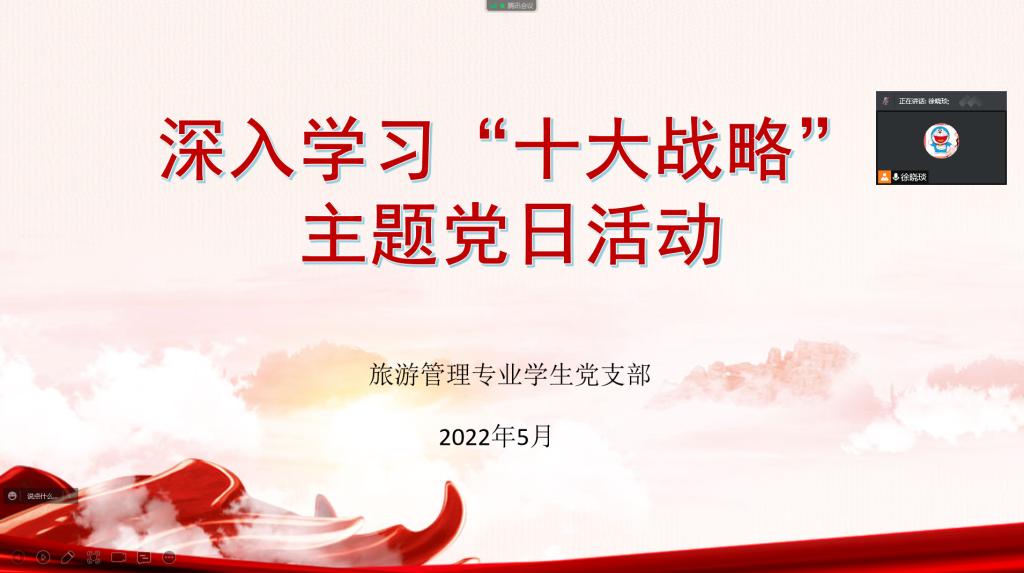 为深入学习贯彻省第十一次党代会精神,把支部全体党员的思想和行动统一到大会精神上来,5月19日,旅游管理专业学生党支部线上开展了5月份“深入学习‘十大战略’”主题党日活动。会议由徐晓琰主持。