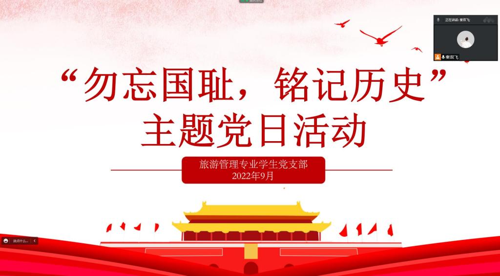 9月19日,旅游管理专业学生党支部线上开展了“勿忘国耻,铭记历史”为主题的党日活动。会议由支部书记秦双飞主持。