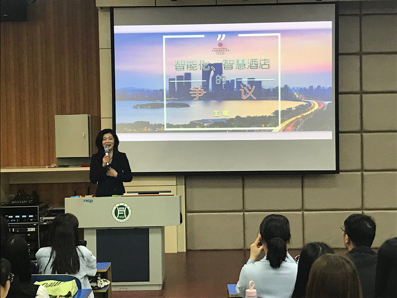 王琪女士从智慧酒店的发展现状及趋势、智慧酒店流程再造的核心、目前最先进的智慧酒店技术、智慧酒店不同观点的认知、无前台智慧酒店等方面作了精彩讲解,王琪女生以其二十余年的酒店从业经历、丰富的职场经验与同学们互动交流,同学们积极提问,现场氛围十分活跃,互动环节使同学们对酒店管理行业有了更深层次的认识。最后,王琪女生从职场出发,介绍了酒店人所遵循的职业习惯,鼓励同学们要抓住在校时光,多学、多做、多参与,在学好专业知识的同时积极参加社团活动,热心公益,并对同学们的学习和生活提出美好祝愿。