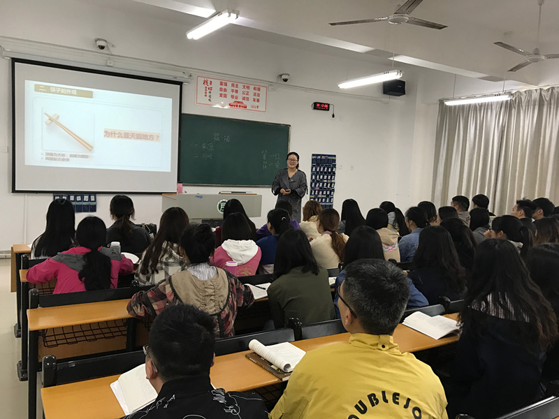 李媛媛老师主讲了中式餐具——筷子的来源及其背后的文化寓意。在整个授课过程中,李媛媛老师讲课富有激情,讲课方式幽默,课程组织严谨而有序,教学过程完整而丰富,课堂气氛十分活跃。通过对筷子的来源、外观、功效、寓意及文化内涵和使用方法的讲授,让学生深刻地了解了原来一双简单的筷子背后还有这么多的文化知识。
