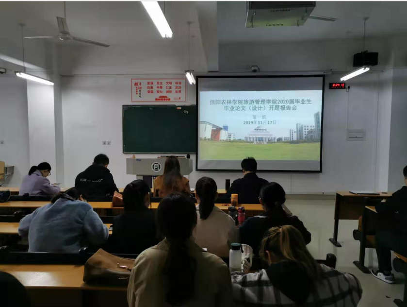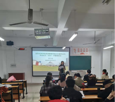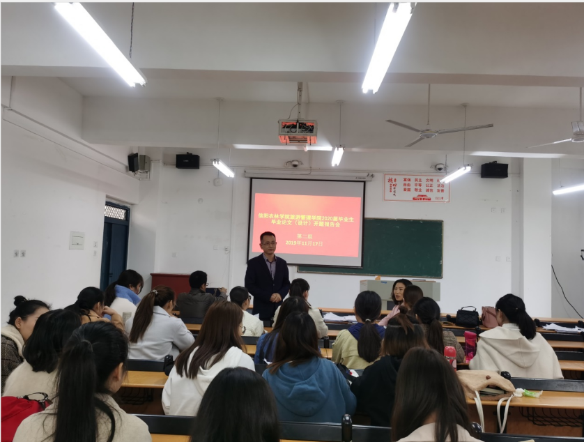 2019年11月17日,旅游管理学院在2教举行2020届酒店管理毕业生毕业论文(设计)开题报告会,刘开华院长、陈建国书记、陈婷副院长、余兵副院长、其他旅游管理学院教师及2020届酒店管理专业全体本科毕业生参加。本次开题报告会分五组进行。