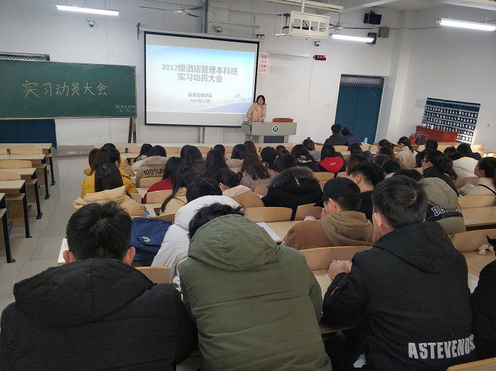 为了使同学们能够更好的适应即将到来的实习工作。12月28日上午,旅游管理学院在二教304召开2017级酒店管理本科班实习动员大会。旅游管理学院院长刘开华、副院长陈婷、党总支副书记杜丽、酒店管理本科辅导员陈果和2017级酒店管理专业全体同学参加了本次动员大会。