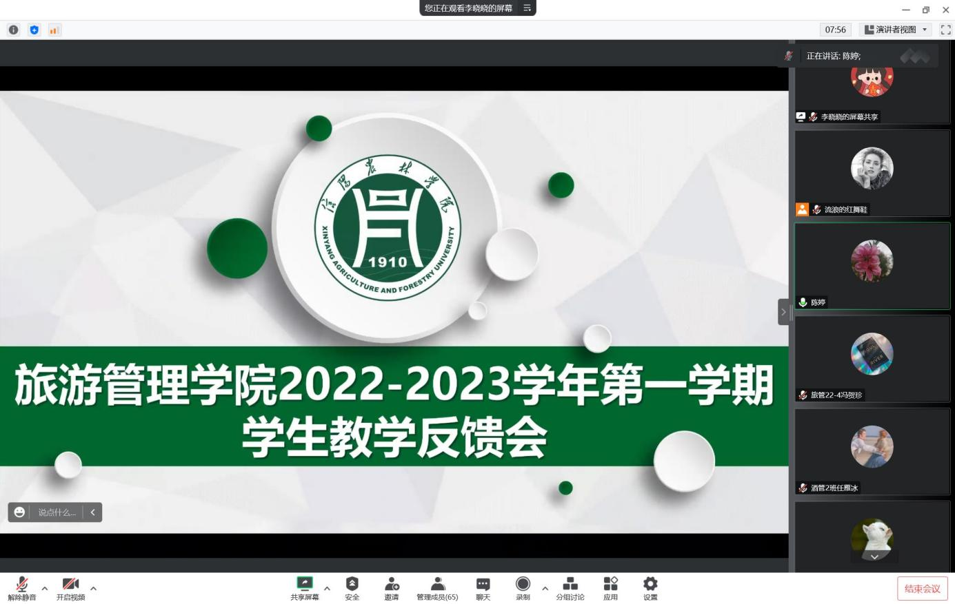 为认真贯彻落实党的二十大精神,落实立德树人根本任务,促进教育教学工作更好开展,加强院系、师生之间的交流,进一步了解疫情防控期间学生在线上课堂以及课余学习方面存在的问题,有效探索改进措施,2022年11月10日中午旅游管理学院通过腾讯会议召开线上2022-2023学年第一学期学生教学反馈会。此次会议由旅游管理学院副院长陈婷主持,教学秘书、各教研室主任、副主任及各班学习委员等50余人参加此次会议。