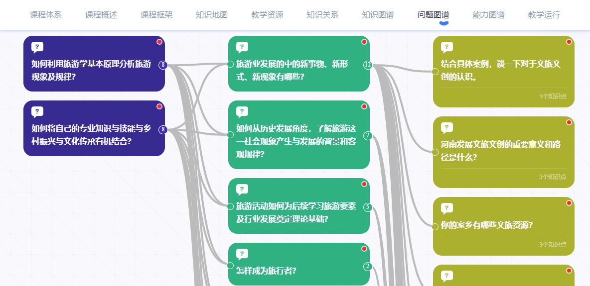通过《旅游学》课程知识图谱实现课程知识体系与教学资源的有机融合,形成“多模态”的资源学习空间,除了将课程已有的视频资源,还将课程的教材、丰富的外延视频动画资源、思政案例资源等进行梳理和结构化关联,同时标注课程的重难点、技能点、思政点等,既有助于学生将知识点整合为系统性的知识结构,同时也激发学生自主思考和深度学习。此外,该课程还注重整合中华优秀传统文化的传承与传播,并结合知识拓展、课程思政,提升创新思维能力和解决实际问题的能力,培养文旅复合型创新技能人才。