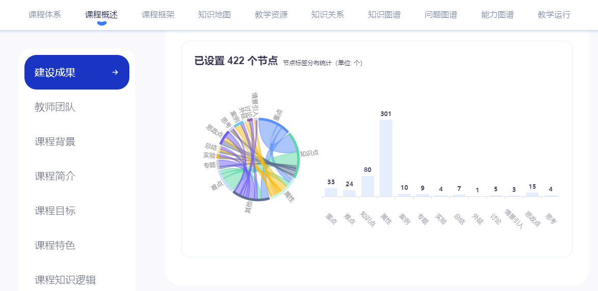该知识图谱基于先进的人工智能技术和自然语言处理算法,将《旅游学》的各个知识点有机地联系起来,形成了一个完整的、多维度的知识网络。根据课程目标,以课程能力要求为顶层设计,将知识领域、知识单元、知识点进行可视化的呈现,并对每个知识点画像进行清晰的描绘和展示,共建成422个节点、知识关系183个、教学资源384个、思政点15个系列。