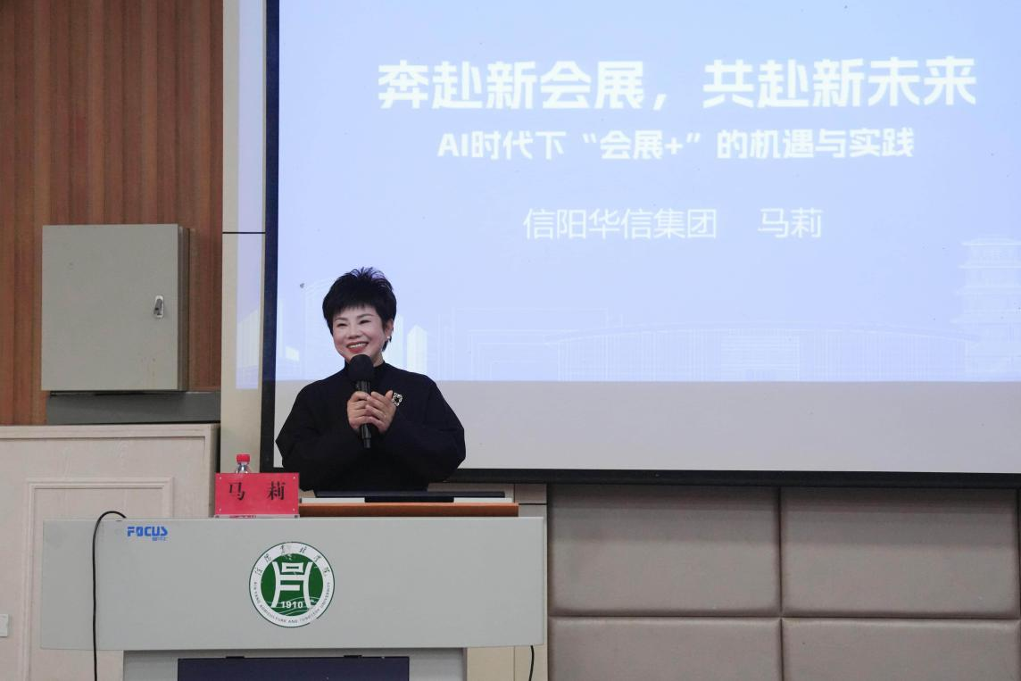 为进一步增强学生专业认知,明确专业学习方向与职业成长路径,10月31日下午,旅游学院邀请信阳建投投资集团副总经理、市百花运营公司党支部书记、执行董事马莉,在一教E101开展“奔赴新会展共赴新未来——AI时代下‘会展+’的机遇与实践”专题讲座,讲座由旅游学院党委书记朱长明主持、学院部分专业教师和2025级会展经济与管理、旅游管理及酒店管理本科专业学生参加。
