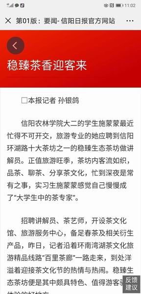 2019年3月28日至4月28日,旅游管理学院郭双双、施蒙蒙、石家璇、许婉琦、胡文西、孙亚荣等学生,实行轮流值班制到稳臻茶坊进行讲解。她们将信阳茶文化、旅游文化、稳臻茶坊美丽的景色展示给每一位客人,受到了游客的一致好评。其中,施蒙蒙同学的优异表现被信阳日报宣传报道。5月10号至11号,旅游管理学院陈世钏、李柱、王溢、王鹏松、冯琳娜、张洁、汪潇佳等同学按照校青工部安排参与全球首届文旅创作者大会志愿服务活动,胡文西、刘佳琳、王应茹、许婉琦、郭双双同学应邀到信阳书画院为前来信阳进行文旅创作的网红、达人们做讲解服务,认真的工作态度、扎实的专业知识得到信阳市和浉河区文旅系统的认可。