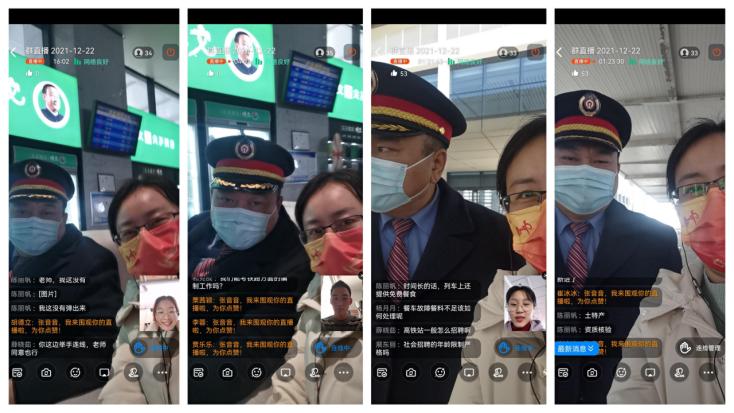 实地参观环节,张老师通过钉钉直播,带领学生们实地参观、了解信阳东站的周边及站内设施设备,并邀请高铁站崔师傅全程陪同,引领学生们熟悉高铁购票、咨询服务、进站安检、检票进站、站台乘车、出站等各环节的具体流程。直播过程中,学生积极与张老师、崔师傅进行连麦互动,咨询所学的专业知识。此外,张老师还登上信阳东始发的G553次动车组列车进行直播,带领学生观摩乘务人员的日常工作,以及动车组列车上的各种设施设备。