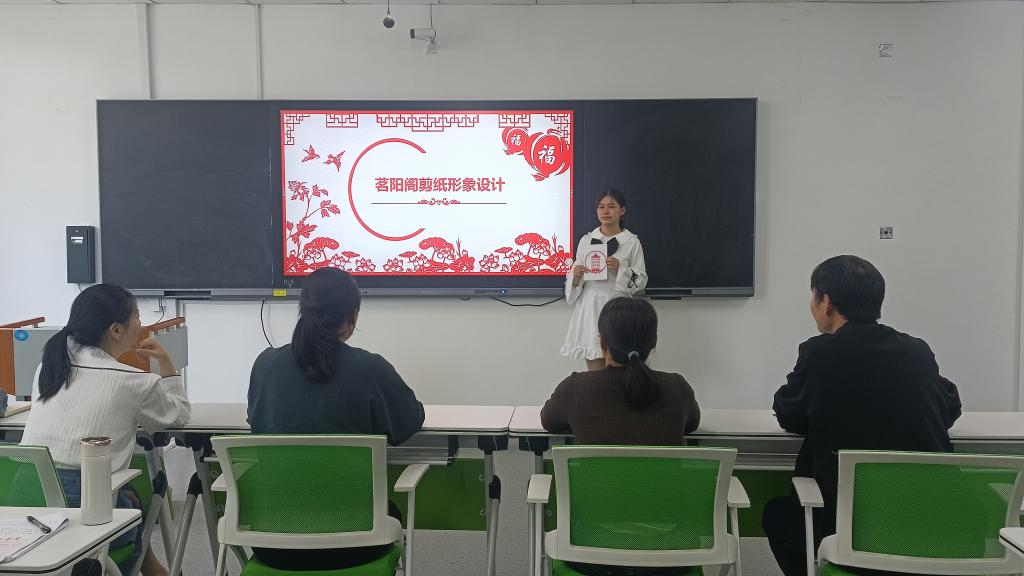 比赛现场,各组队伍按照抽签顺序依次进行团队作品的阐释和展示,主题多样,内容丰富。设计者们的文创作品与信阳地域特色充分融合,包括信阳城市IP形象及logo的插画制作、布老虎、山茶油的创意设计、碎冰蓝干花相框、茗阳阁的剪纸形象设计、独具创新的香包手工艺品,还有别出心裁的橡皮章,充分体现了同学们的想象力与创造力,也表达着设计者对信阳和学院的喜爱和祝福。选手们自信演讲、娓娓道来,现场气氛热烈而又紧张。