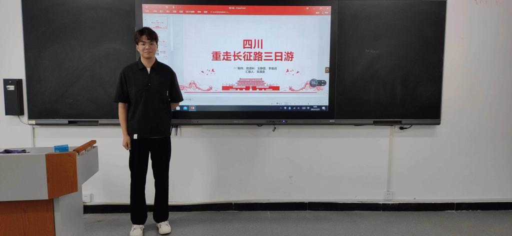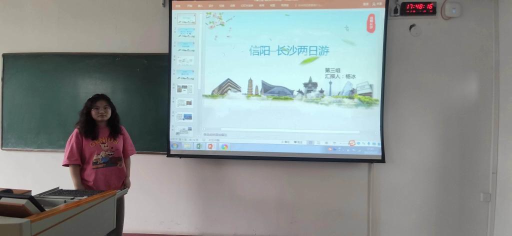 比赛现场,各组队伍按照先后顺序依次进行团队作品的展示,作品紧紧围绕与红色旅游主题相关的旅游路线、旅游产品的开发,内容丰富。设计者们的作品包括,“信阳红色之旅”“四川重走长征路三日游”“南昌市红色旅游路线规划”“北京红色旅游路线”“武汉——信阳红色旅游”“沪浙红色之旅”“井冈山红色旅游路线规划”等等。以上作品充分展现了同学们对于各地红色旅游资源的深入了解与掌握。选手们的演讲充满了对于红色旅游的热爱,现场气氛和谐又热烈。