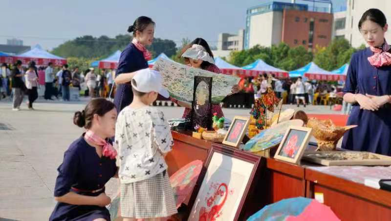 在党总支副书记杜丽、教学副院长陈婷等领导及老师的带领下,“礼show社团”成员精心布置展区,对信阳市非物质文化遗产及民间手工艺品进行展览,包括国家级非物质文化遗产——罗山皮影,省级非物质文化遗产——商城叶雕、淮滨泥叫吹,信阳非物质文化遗产传承人的木雕版画、掐丝珐琅等精美作品,以及剪纸、猫头鞋、油纸伞等民间手工艺品,既带有浓郁的地方特色,又具有极高的艺术价值。在社团指导老师陈芳的组织下,“礼show社团”成员统一着装,以整洁的妆容、大方的仪态,主动热情地对展品进行专业讲解,让同学们深刻感受信阳非遗之美。