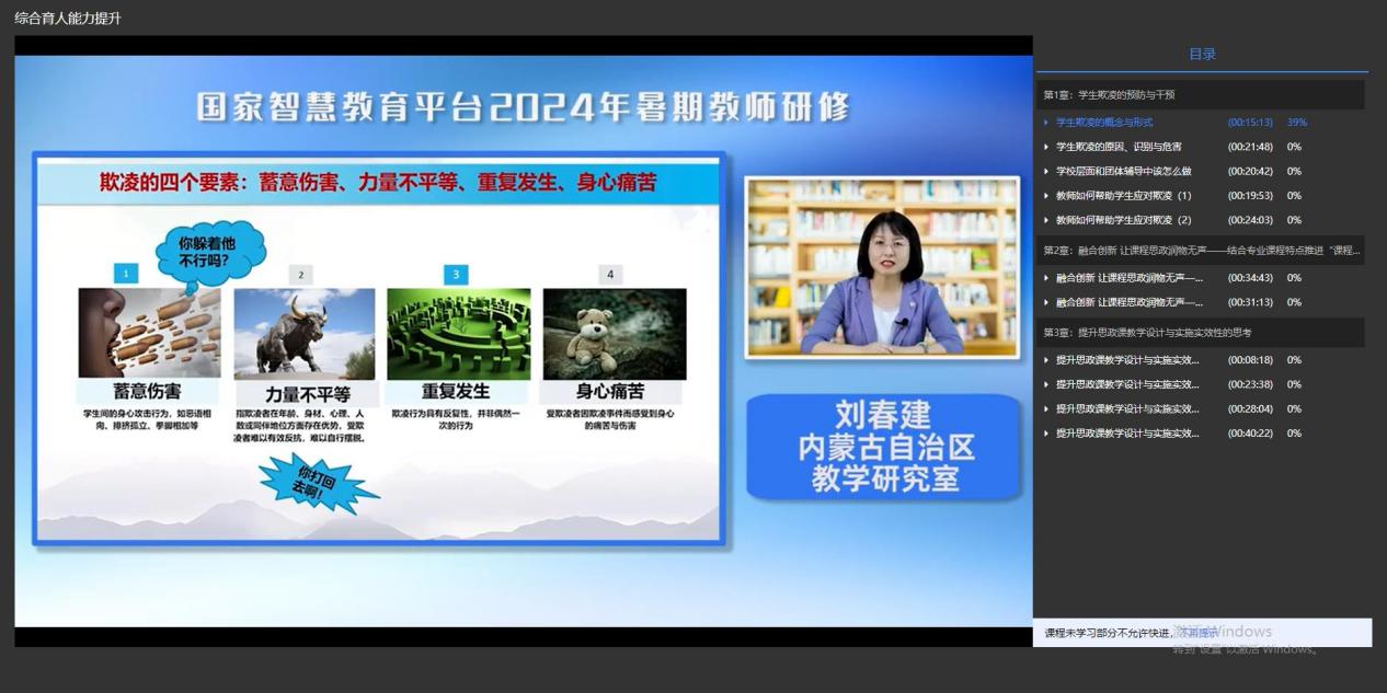 通过培训,一是通过观看黄建平、肖向荣等名师的教育家精神宣讲以及杜天真、李百战等优秀教师的相关视频,体会到了新时代青年教师不但要静心教书、潜心育人,更要学高为师、德高为范。二是通过对中国精神、中国革命歌谣、中国史的学习,提升了民族自豪感和文化认同,通过学习国家安全知识,增强国家安全意识与文化自信。三是进一步了解了人工智能在教育工作中的价值,在教学过程中加强数字化意识,提升数字化技能的应用能力。四是通过观看数字化资源,我拓宽科学视野,提高科学素养和科学教育能力。五是通过心理健康教育能力提升培训环节深入了解到大学生常见心理问题的识别与应对,同时了解到高校教师维护好自身心理健康状况的重要性。六是了解了学生欺凌的原因、危害与识别方式,从辅导员的角度维护班级团结与和谐。七是通过高水平专家报告、教学实践案例、教研教改经验等专题分享,深入学习教学创新、教师教学能力发展、教学研究与教改项目,AI助力教学等相关内容。