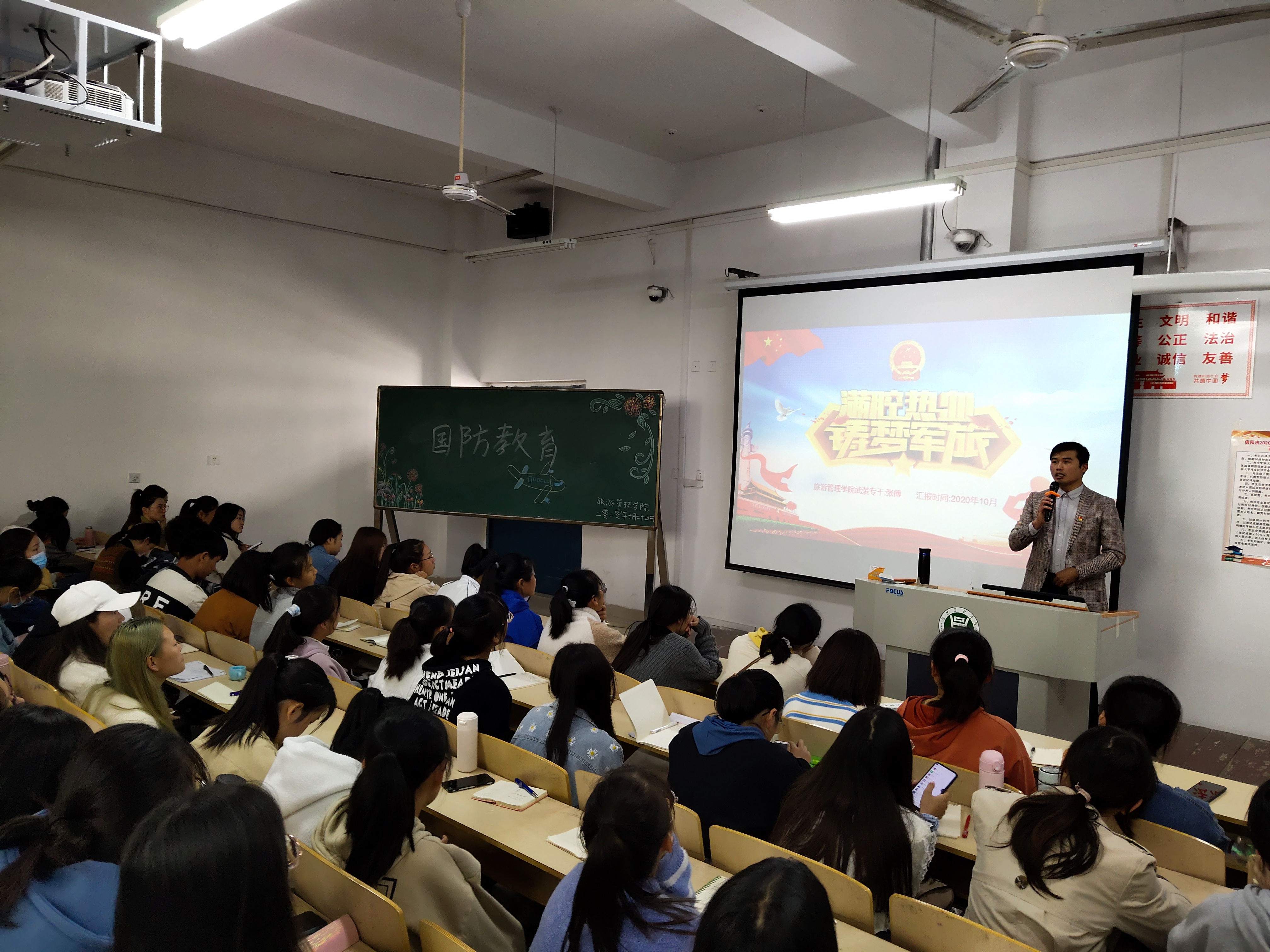 为了增强学生的国防观念,提升国防意识10月24日晚,旅游管理学院分别在二教305和二教306开展国防教育讲座,由武装专干张博主讲,新生辅导员及2020级全体新生参加。