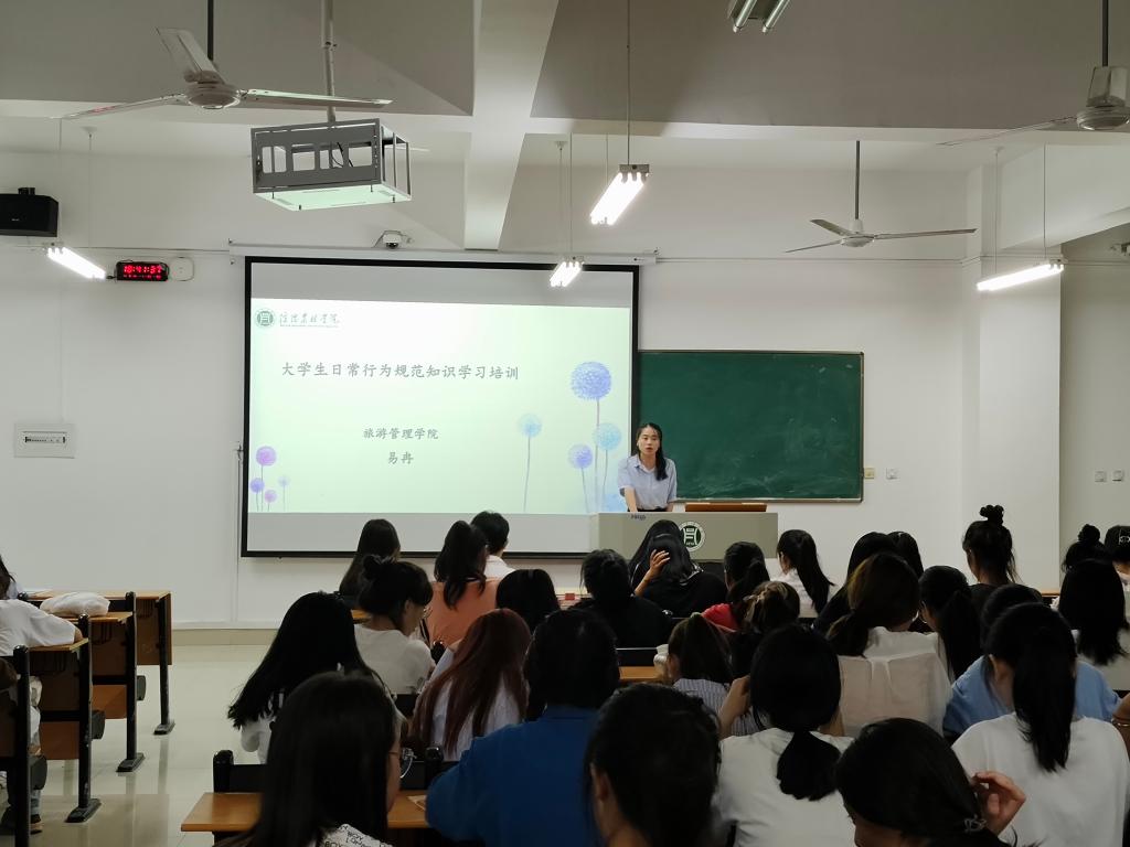 新学期,新气象,新开端,新风貌,为更好促进同学们提升文明素质,养成文明习惯,培养同学们自我完善、自我管理的能力,9月19日-22日,旅游管理学院组织各班开展“开学第一课”—大学生日常行为规范培训会,会议由各班辅导员主持,班级全体同学参加。