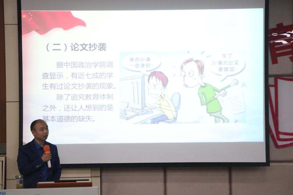 陈建国重点围绕大学生开展廉洁教育的意义、大学生加强廉洁意识途径等开展论述。通过包拯《诫廉家训》和孔繁森、焦裕禄优秀党员先进事迹,深入浅出地为学生讲述了廉洁素养在每个同学个人生涯中的重要性,强调了立德修身的意义。并将廉洁教育与大学生诚信教育联系在一起,阐述了高校大学生不廉洁修身的具体表现,如考试舞弊、论文抄袭、骗取助学金、骗取或者恶意拖欠国家助学贷款、部分学生干部行为失范、不当网络言行等。陈建国鼓励新生要树立廉政高尚的品格和正确的利益观,以清正廉洁者为榜样,传承廉洁的精神追求,在校期间勤俭节约,不盲目攀比,不奢侈浪费;诚实守信、不弄虚作假、以权谋私、不急功近利,通过勤奋学习、积极参加志愿实践,来实现自己的奋斗目标。