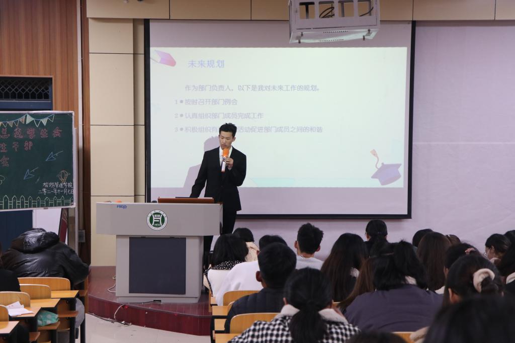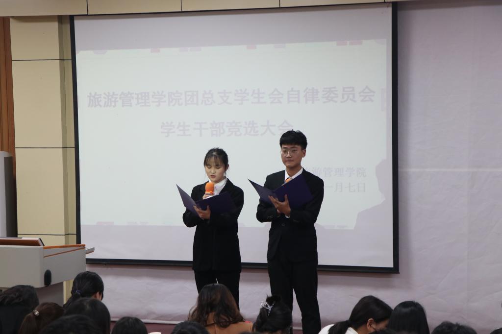 为促进我院学生管理工作的持续稳定发展,给学生管理队伍融入新鲜血液,同时给学生搭建一个展现自我、实践自我的平台,11月7日晚,旅游管理学院团总支学生会自律委员会干部换届竞选大会在二教204拉开帷幕。院党总支副书记杜丽、学工组全体老师、2020届团总支学生会自律委员会主席团成员及各部门学生干部代表以及20级学生代表参加了此次大会。