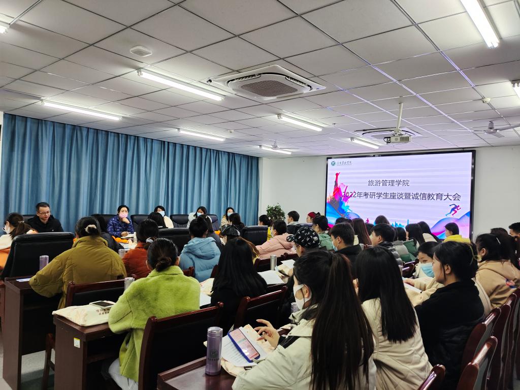 2021年12月21日,旅游管理学院在双创中心310召开了2022年考研学生座谈暨诚信教育大会。院党总支副书记杜丽、副院长陈婷、余兵、毕业班辅导员张春焕、王亚君、秦双飞及全院70余名考研学生参加了本次座谈会。