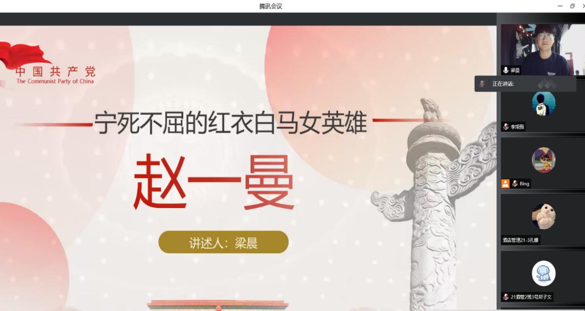 值此清明,为缅怀革命先烈,重温红色记忆,进一步引导学生铭记中国共产党光辉历程,弘扬爱国主义精神,4月1日晚,旅游管理院举办了线上“纪念革命先烈,传承红色经典”红色故事分享活动。活动由院团总支书记王芳主持。