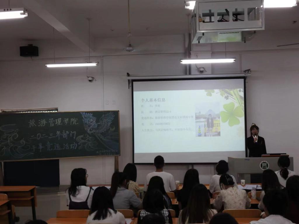 为进一步加强学院学生干部队伍建设,优化学生干部结构,5月13日中午,旅游管理学院在二教304顺利举办了2023年团总支学生会自律委员会部门干事竞选大会。院专、兼职辅导员张博、易冉、王佳倩、周新玲、陈芳等五位老师和学院现任主席团成员、各部门负责人以及22级竞聘人员参加了此次大会。